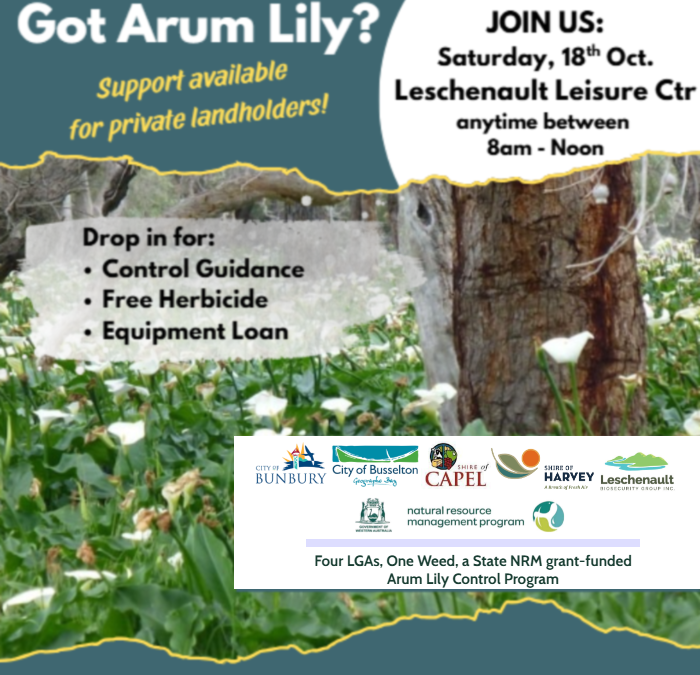 This event is part of the Four LGAs, One Weed Arum Lily Control Program a a State NRM grant-funded program Arum Lily control program providing resources to help private landholders tackle Arum Lily infestations on their properties. This program is being delivered in collaboration by the Local Government Authorities of Bunbury, Busselton, Capel and Harvey and the Leschenault Biosecurity Group.